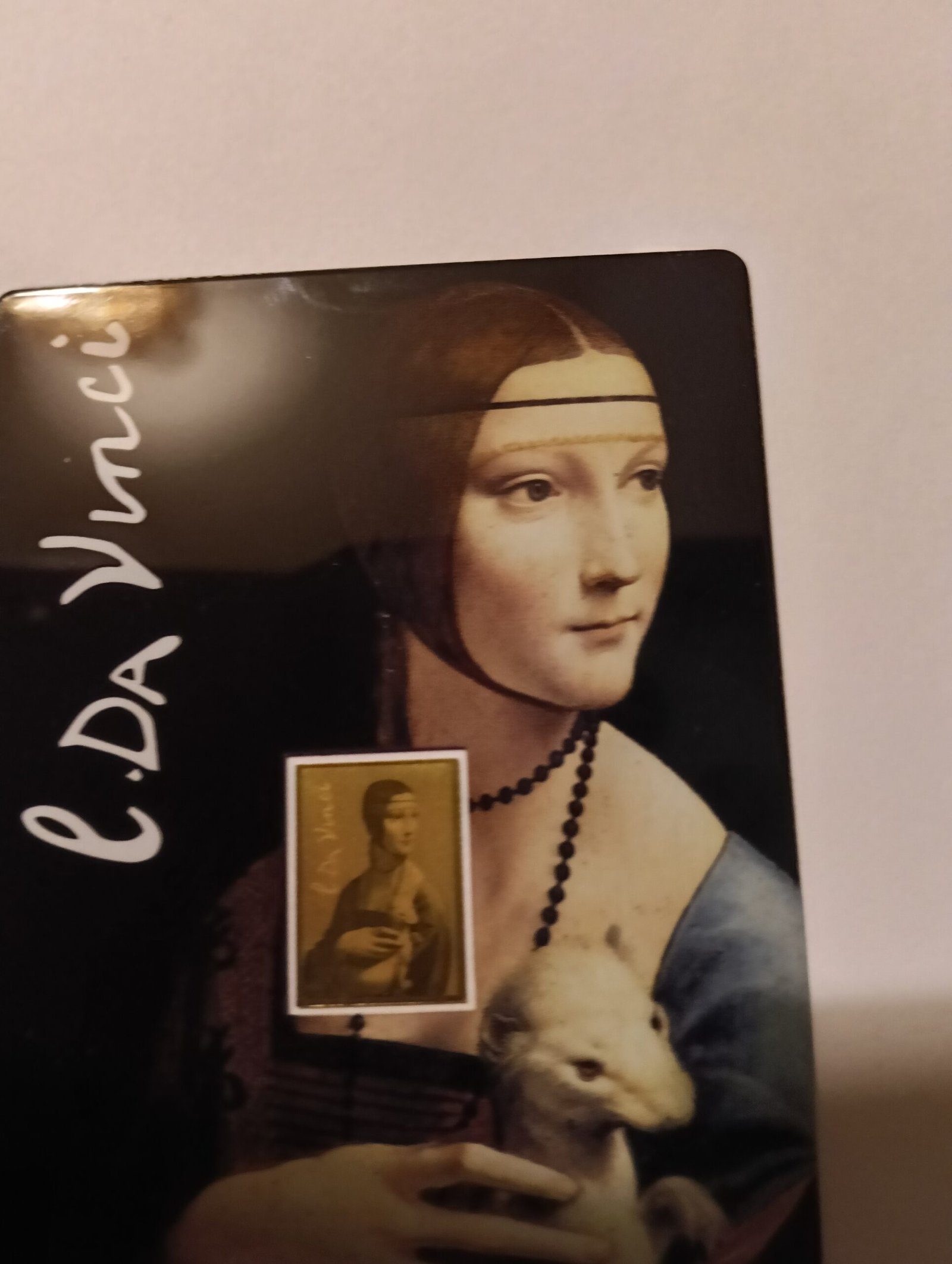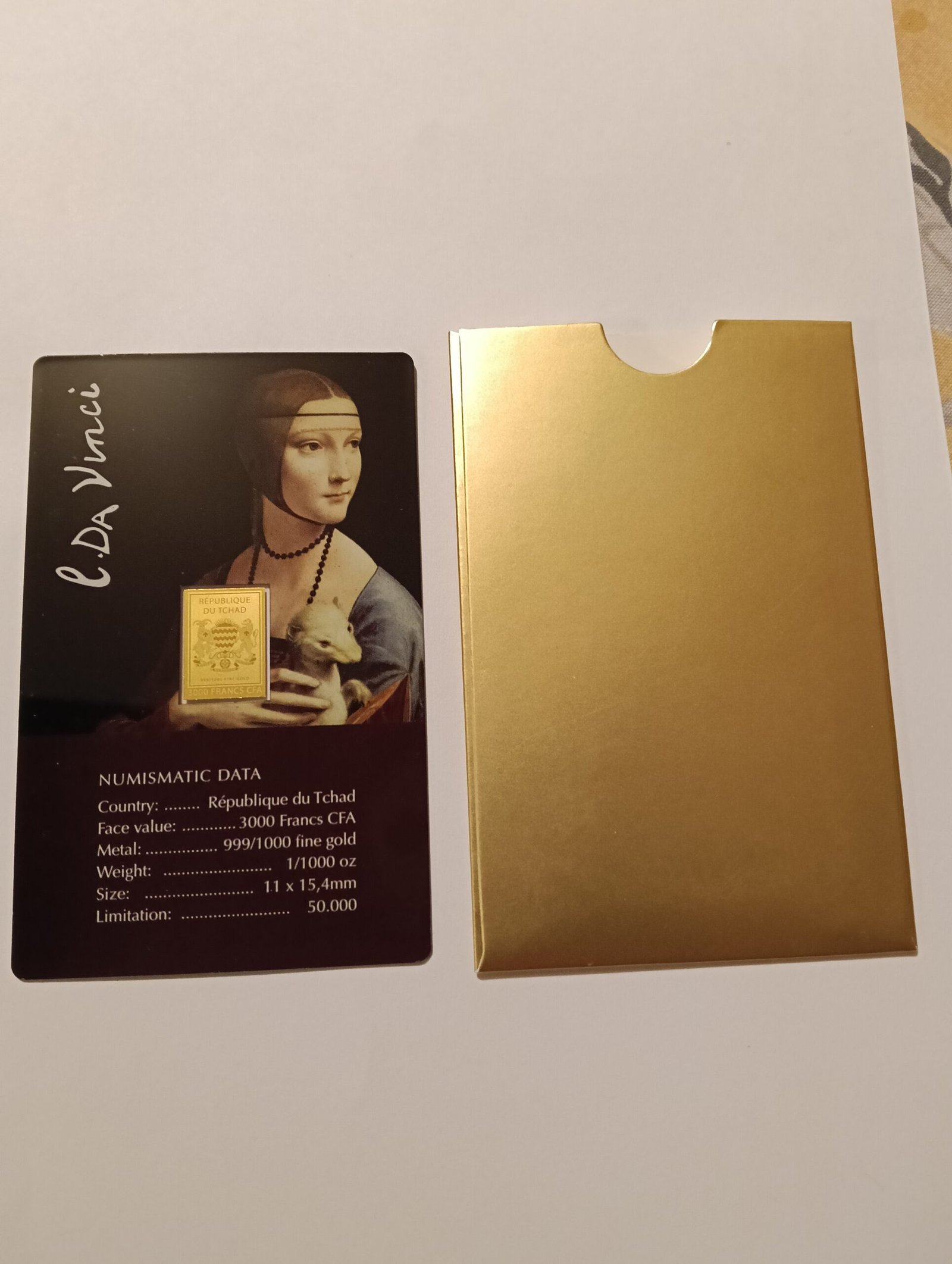 The obverse of the coin card showcases the poised figure of Cecilia Gallerani holding a white ermine—an image renowned for its lifelike realism, subtle expression, and symbolic elegance. At the center, the 1/1000 oz fine gold coin is embedded and finely embossed with a detail from the painting, complemented by a graceful inscription.