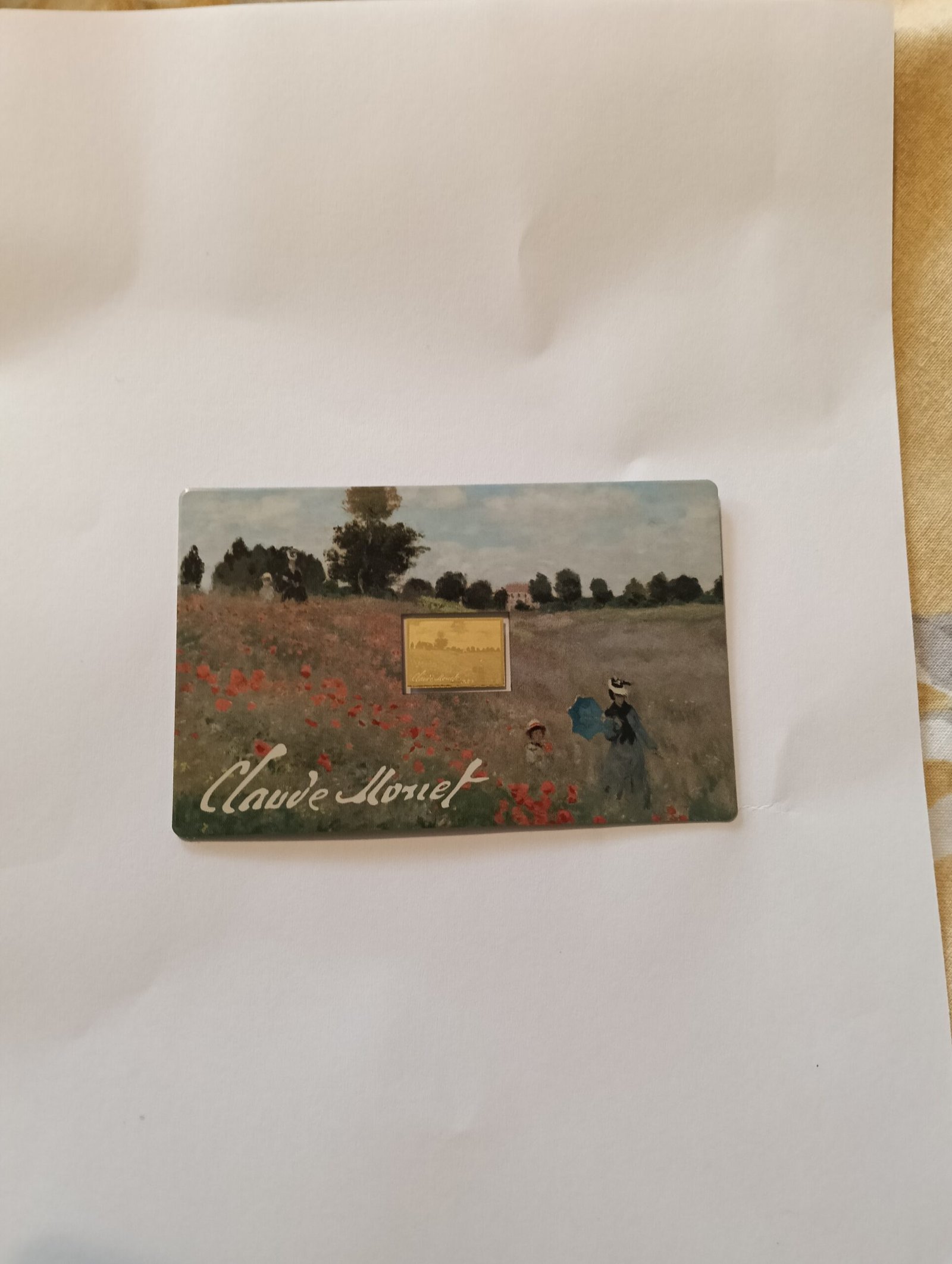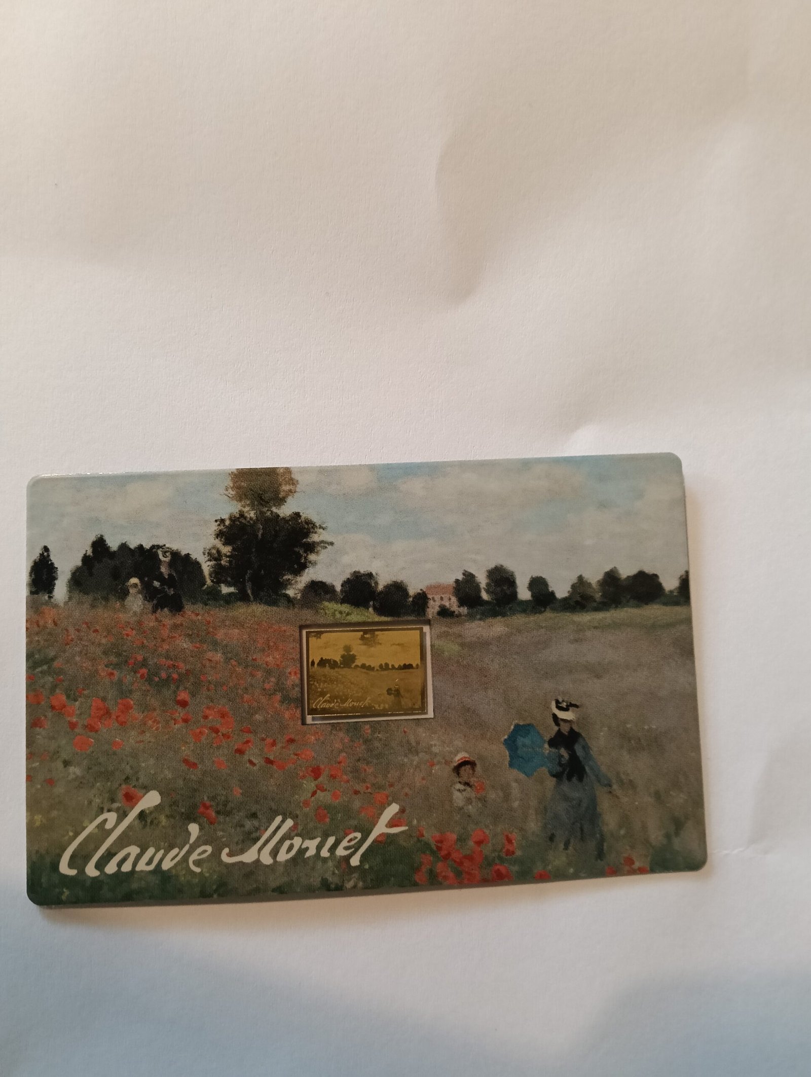This attractively designed coincard features an integrated gold coin featuring the motif “Poppies near Argenteuil” by Claude Monet. The obverse of the coincard depicts a vibrantly colored section of the famous painting, in which a woman and child walk through a field of poppies. The motif reflects a typical moment of French Impressionism, inspired by nature and the play of light.