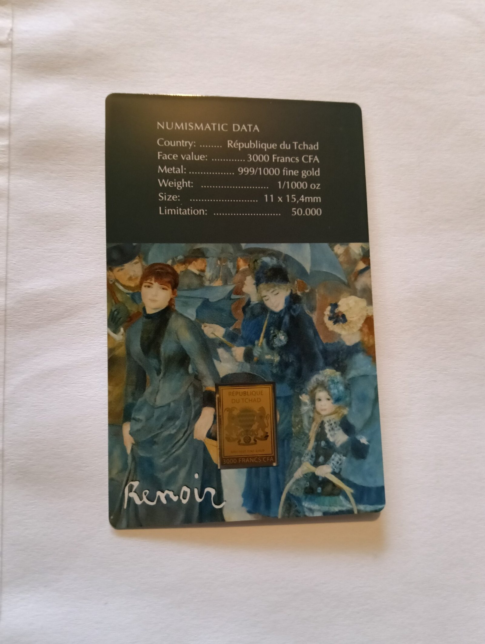 The Umbrellas by Renoir 1/1000 Oz 999 Gold Coin Bar 3000 Francs Chad